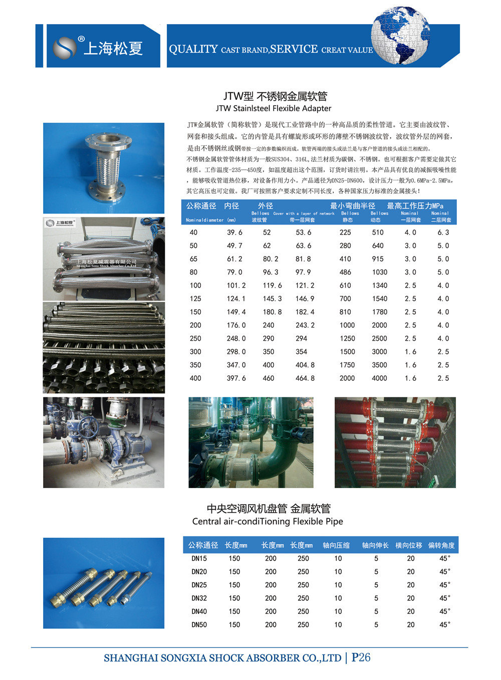 在工程中采用的泵和壓縮機等設備在工作狀態(tài)下,它們會產(chǎn)生振動和噪音,危機工程質(zhì)量和人體健康,金屬軟管具有良好的隔振,降噪作用,在泵和壓縮機等設備進出口處安裝一定長度的金屬軟管,可以減振、降噪、提高工程質(zhì)量和使用壽命,但若盲目選用則不僅收不到良好效果,反而會使管路系統(tǒng)提前振壞。我們在借鑒國內(nèi)外先進技術(shù)的基礎上,結(jié)合產(chǎn)品實際使用狀況,規(guī)劃設計了泵用金屬軟管JTW系列,供工程設計和施工中選用。