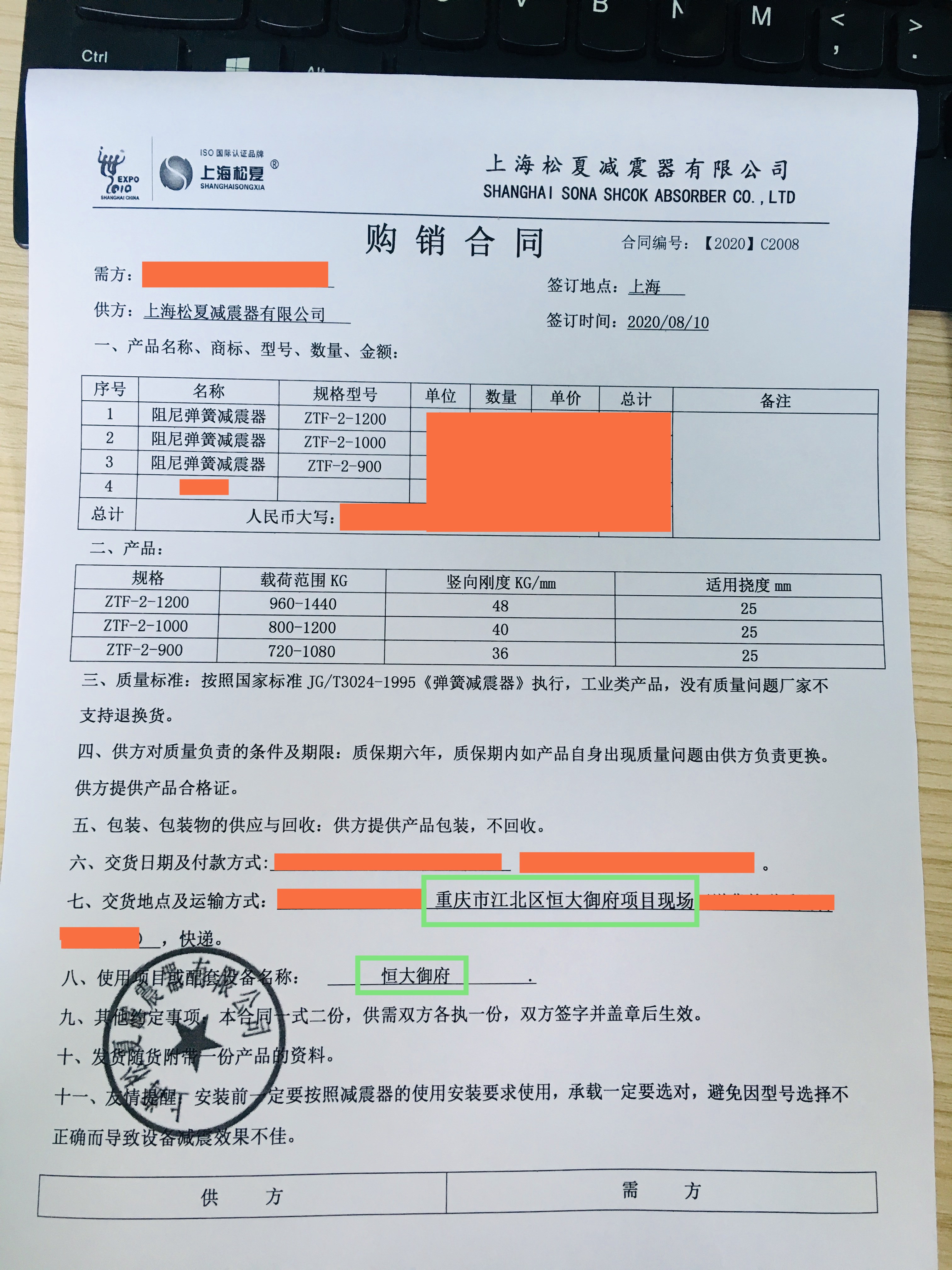 上海松夏減震器有限公司官方網站為您介紹:【恒大御府配套】上海松夏阻尼彈簧減震器采購合同信息,我們松夏公司2020年為【恒大御府配套】上海松夏阻尼彈簧減震器,起到了減震和降噪的作用,以下是【恒大御府配套】上海松夏阻尼彈簧減震器采購合同介紹。